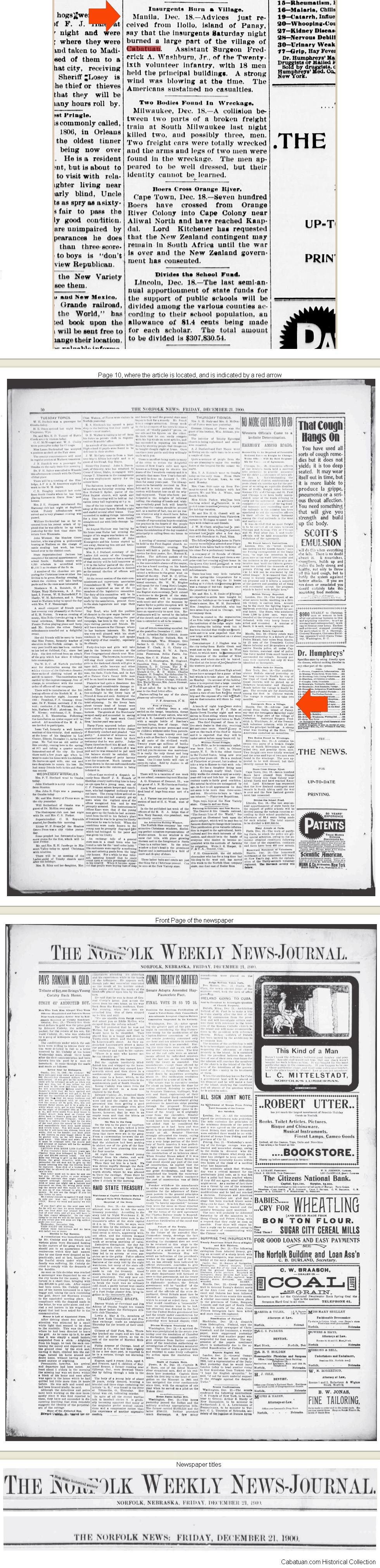 This article about Cabatuan appeared in 1900 in Norfolk Nebraska (United States) on Page 10 of The Norfolk Weekly News-Journal, Friday, December 21, 1900. The start of the Cabatuan article is indicated by a red arrow. The word Cabatuan is highlighted in red. |