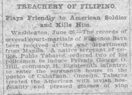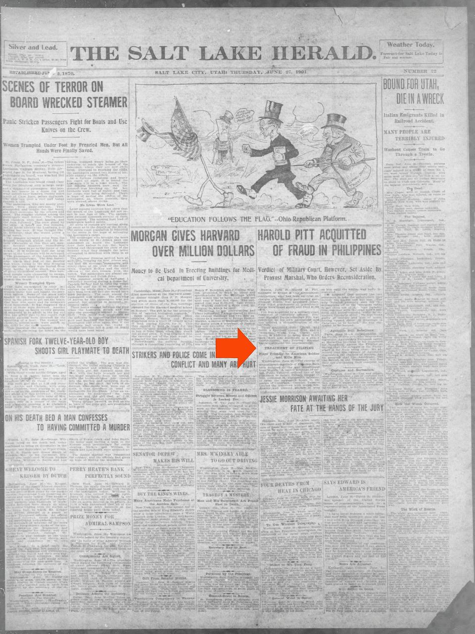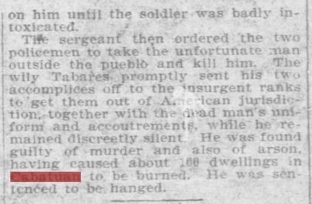 This article about Cabatuan appeared in 1901 in Salt Lake City, Utah (United States) on the front page of The Salt Lake Herald, Thursday June 27, 1901. The word Cabatuan is highlighted in red. |