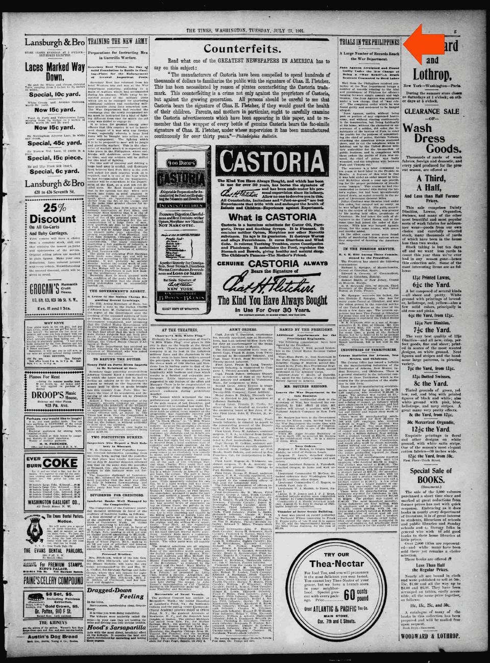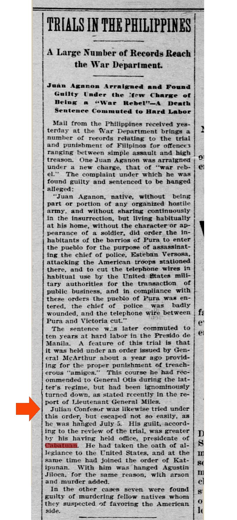 This article about Cabatuan appeared in 1901 in Washington D.C. (United States) on Page 5 of The Washington Times, Tuesday July 23 1901 The word Cabatuan is highlighted in red. |