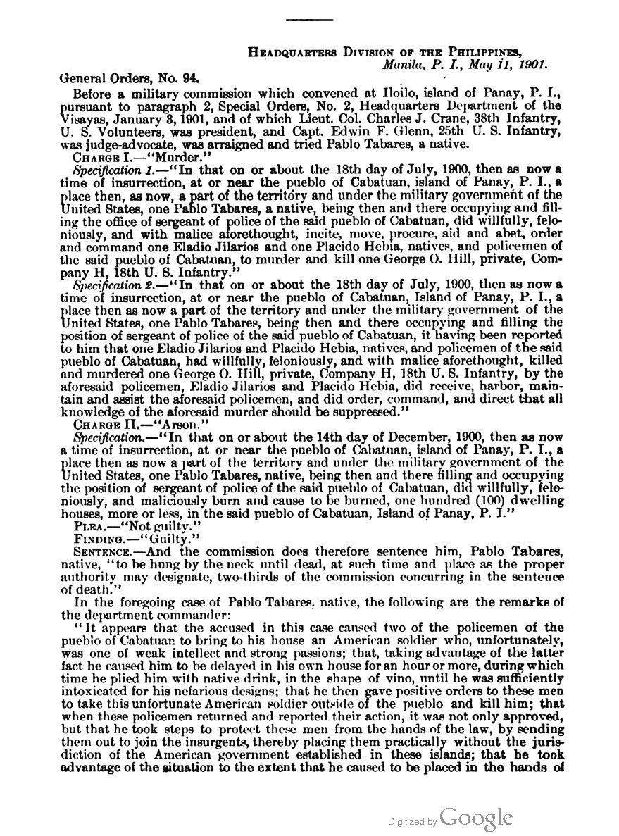 Before a military commission which convened at Iloilo, island of Panay, P. I., pursuant to paragraph 2, Special Orders, No. 2, Headquarters Department of the Visayas, January 3,1901, and of which Lieut. Col. Charles J. Crane, 38th Infantry, U. S. Volunteers, was president, and Capt. Edwin F. Glenn, 25th U. S. Infantry, was judge-advocate, was arraigned and tried Pablo Tabares, a native.