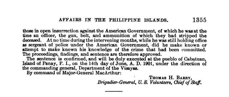 The sentence is confirmed, and will be duly executed at the pueblo of Cabatuan, Island of Panay, P. I., on the 14th day of June, A. D. 1901, under the direction of the commanding general, Department of the Visayas.