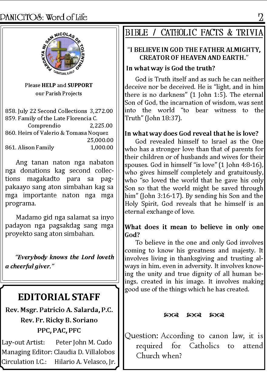 A Weekly Publication of the Parish of San Nicolas de Tolentino, Cabatuan, Iloilo