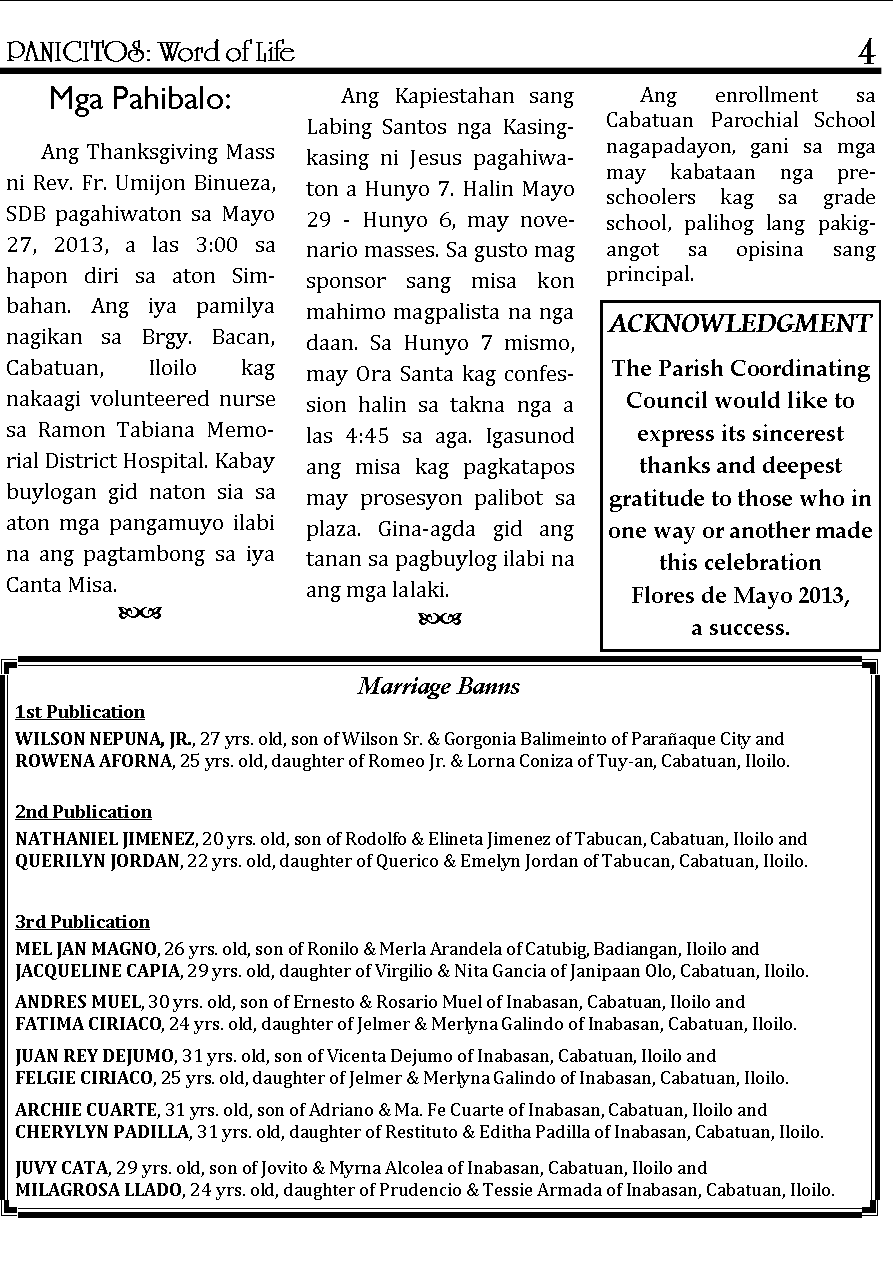 A Weekly Publication of the Parish of San Nicolas de Tolentino, Cabatuan, Iloilo, Philippines