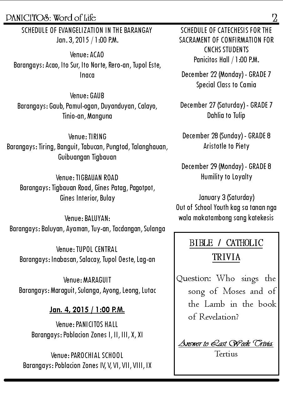 SCHEDULE OF EVANGELIZATION IN THE BARANGAY