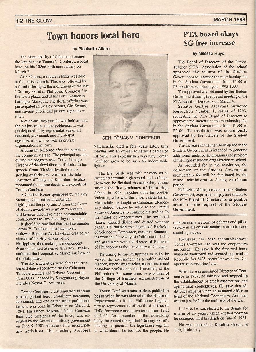The Municipality of Cabatuan honored the late Senator Tomas V. Confesor, a local hero, on his 102nd birth anniversary on March 2.