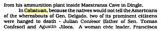 "In Cabatuan, because the natives would not tell the Americans of the whereabouts of Gen. Delgado, two of its prominent citizens were hanged to death - Julian Confesor (father of Sen. Tomas Confesor) and Agustin Jiloca."