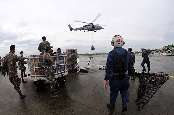 A HH-60H helicopter from Helicopter Squadron 4 delivers another pallet of bottled water from the deck of USNS Niagara Falls (T-AFS 3) for delivery to the northern tip of Panay Island