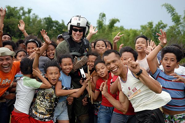 PANAY ISLAND, Philippines (June 28, 2008) Aviation Warfare Systems Operator Airman John Baker, a native of Tampa, Fla. assigned to the "Black Knights" of Helicopter Anti-Submarine Squadron (HS) 4, poses for a photo with Alimodian residents after delivering relief supplies in the wake of Typhoon Fengshen. The aircraft carrier USS Ronald Reagan (CVN 76) is off the coast of Panay Island providing humanitarian assistance and disaster response. U.S. Navy photo by Mass Communication Specialist 2nd Class Jennifer S. Kimball (Released)