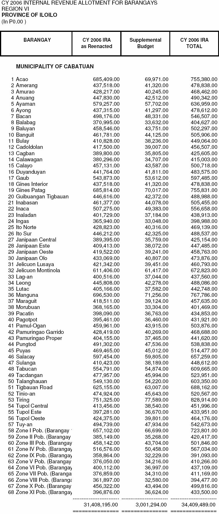 CABATUAN BARANGAY INTERNAL REVENUE ALLOTMENTS, CY 2006
