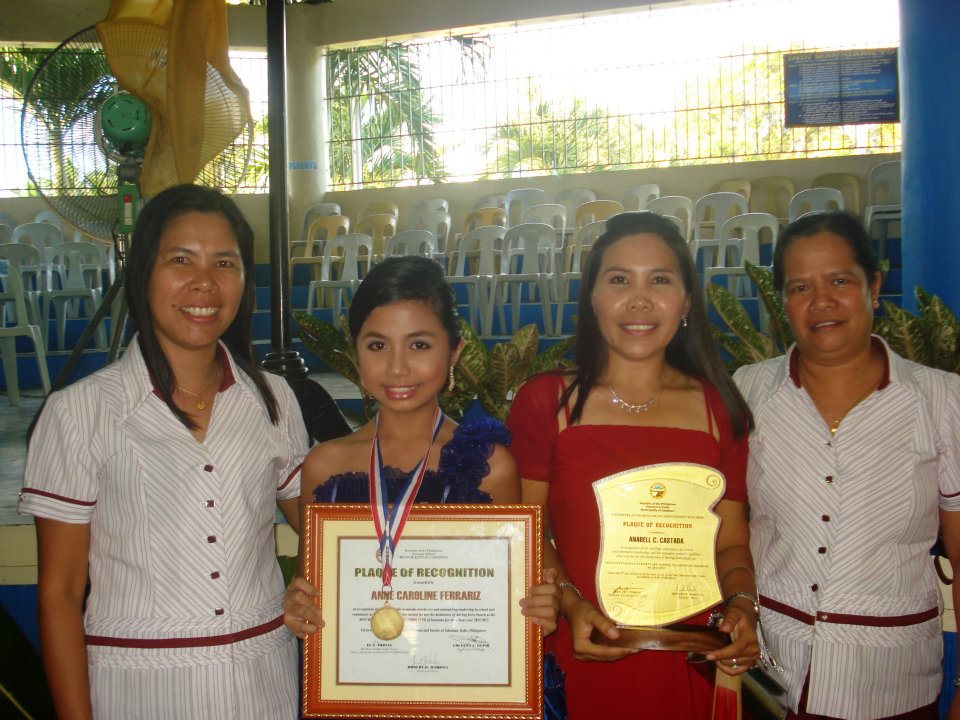 She topped both examination and interview portions conducted on February 13, 2012. The awarding was held on March 2, 2012 in Cabatuan, Iloilo. Caroline is a Grade VI pupil (Special Science Class) of Cabatuan Central Elementary School. The ten outstanding pupils, students and teachers of Cabatuan for SY 2011-2012 were as follows. Ten Outstanding Elementary School Pupils: 1. Anne Caroline Ferrariz -Cabatuan Central Elementary School 2. Lourde Francis Mye Almarza -Cabatuan Central Elem. School 3. Ellaine Rare Junio -Cabatuan Central Elementary School 4. Jun Sun Magcanam -Cabatuan Central Elementary School 5. Paula Angelique Caballero -D. Lujan Elementary School 6. J Dorillo -Gaub Elementary School 7. Marie Claire Delos Santos -Cabatuan Parochial School 8. Romnick Sulit -E. J. Hobilla Mem. Elem. School 9. Novie Jendel Saliganan -Tiring Central Elem. School 10. Colleen Kate Licera -Tigbauan Road Elem. School Ten Outstanding High School Students: 1. Rumel Angelo Alfaro -CNCHS 2. Giovanni Cerbaña -CNCHS 3. Jade Ermitaño -CNCHS 4. Ma. Kristine Bueron -CNCHS 5. Shacel Rose Estimar -CNCHS 6. Karla Tangeres -CNCHS 7. Daryl Jan Padilla -CNCHS 8. Patricia Ann Gubagaras -CNCHS 9. Lloyd Pilarta -CNCHS 10. Kenneth Mainar -CNCHS Outstanding Elementary School Teachers: Anabell Castada -CCES Jinky Libuna -Puga Elementary School Joenivel Brunia -Inaca Elem. School Julius Penit -Tiring Central Elem. School Lea Burao -CCES Analyn Mijares -CCES Outstanding High School Teachers: Christian Grana -CNCHS Jimmy Olmos -CNCHS Benjamin Jalique -Tiring National High School Teddy Gabanite -CNCHS Photos and infos by Anne Caroline Grana Ferrariz and Francisco Gonzaga III (lists) Send this page to your facebook friends or groups. Click here -> |