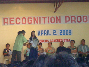 CABATUAN.COM ACHIEVEMENT AWARD 2009 for Outstanding contributions to the advancement of Cabatuananons in the internet (Gold Medal + Certificate + Cash Award) Awarded to CRISTINA MAE TRONCO on Recognition Day, April 2, 2009 at Cabatuan National Comprehensive High School |