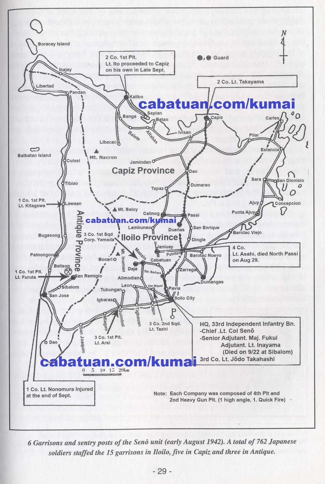 Garrisons and Sentry Posts of the Seno unit (early August 1942). A total of 762 Japanese soldiers staffed the 15 garrisons in Iloilo, five in Capiz and three in Antique. Page 29.