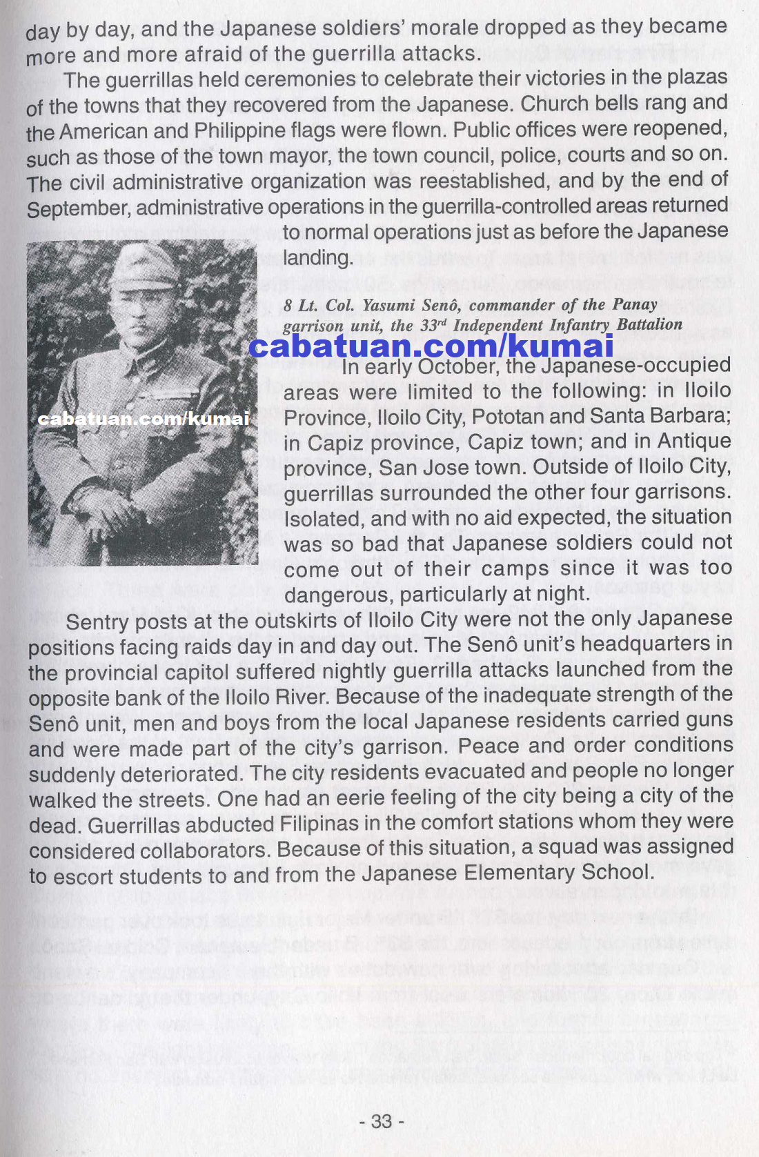Lt. Col. Yasumi Senô, commander of the Panay garrison unit, the 33rd Independent Infantry Battalion. Page 33.