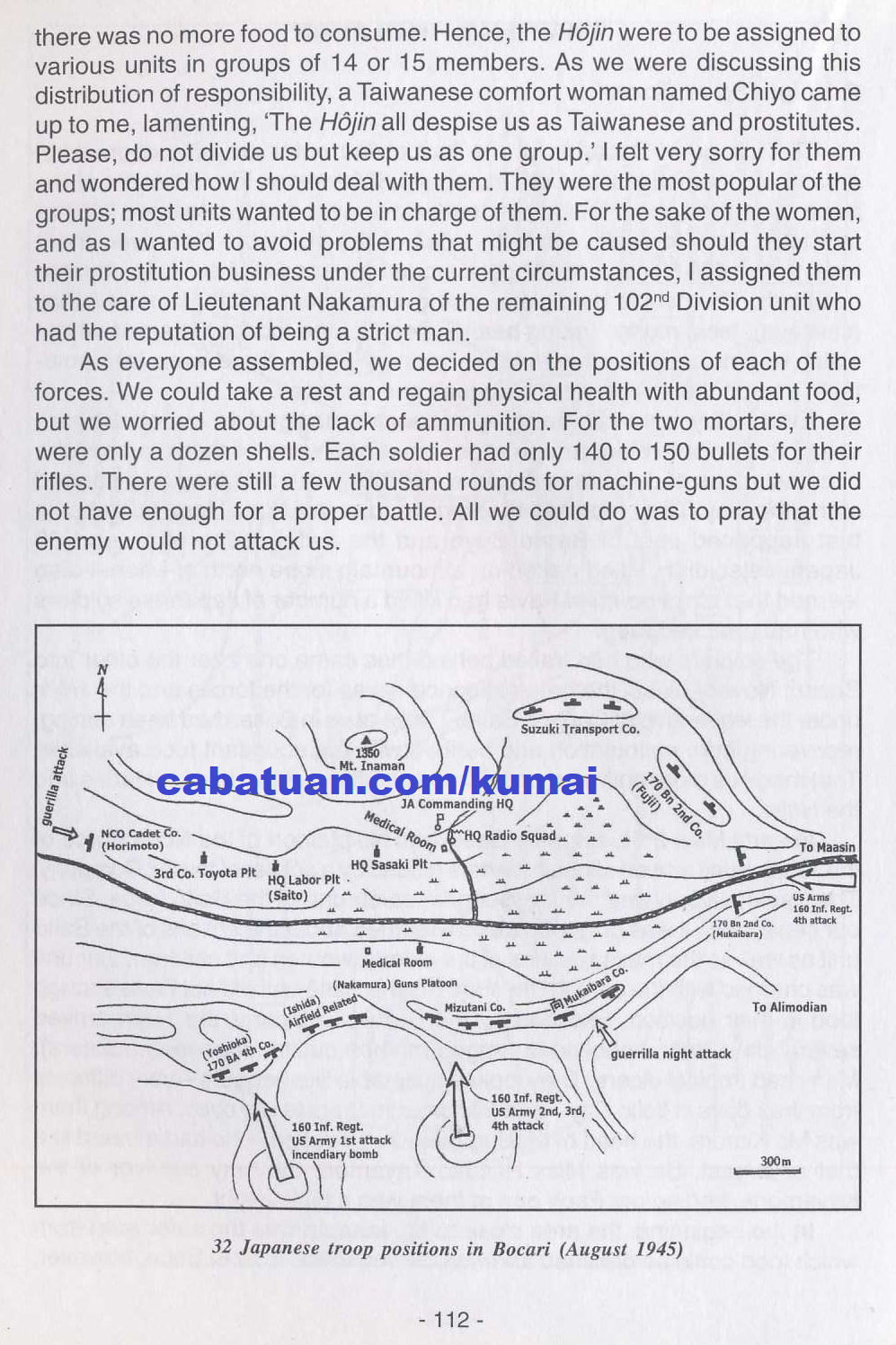 The soldiers who had trailed behind thus came one after the other into Bocari. Nevertheless, the greatest concern was for the forces and the Hôjin under the leadership of Captain Saitô. Those of us in Bocari had been resting, recovering from malnutrition and beri-beri with the abundant food available. That made us more bothered and worried about our separated comrades and the Hôjin.