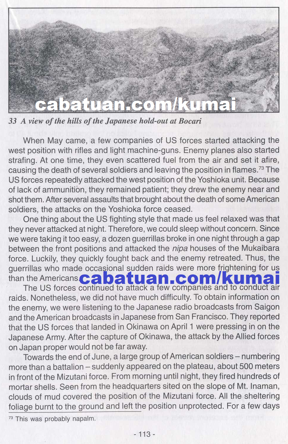 Everyday some Japanese soldiers managed to reach Bocari, exhausted, disheveled, and in rags. I met each one of them to hear the circumstances of Japanese soldiers killed in battle that they had spotted along the way. They reported the tragic end of the Army Hospital patients that happened east of Barrio Buyo and the awful scene of around 30 Japaneses soldiers killed naked on a mountain slope north of Leon. I also learned that tanks south of Pavia had killed a number of Japanese soldiers, who had attacked them.