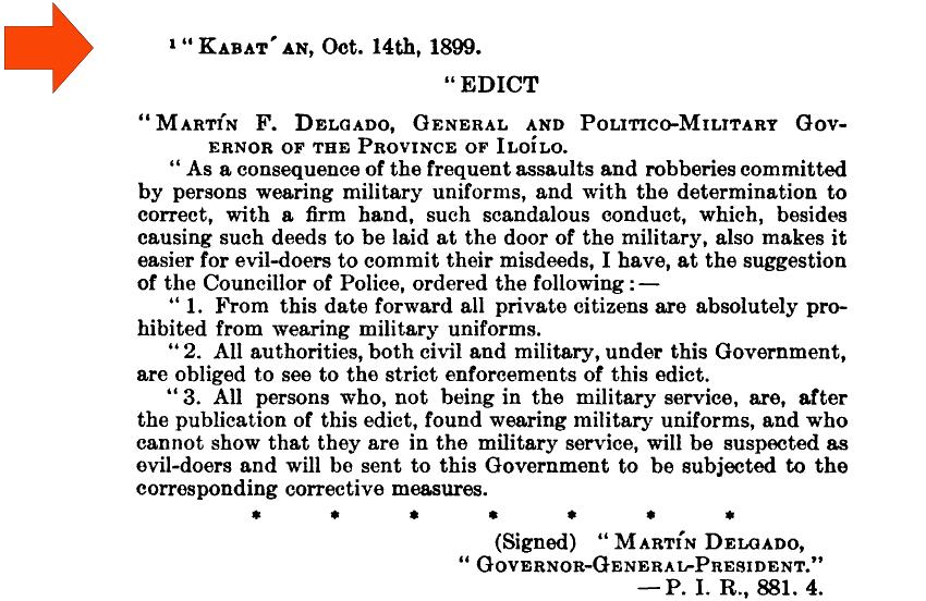 EDICT OF GEN. MARTIN DELGADO (FROM CABATUAN IN OCTOBER 14, 1899) ADDRESSING THE FREQUENT ASSAULTS & ROBBERIES COMMITTED BY MILITARY PERSONS THE PHILIPPINES, PAST AND PRESENT Published 1921 in New York, U.S.A. (Note: The original version of this book was published in 1914) |