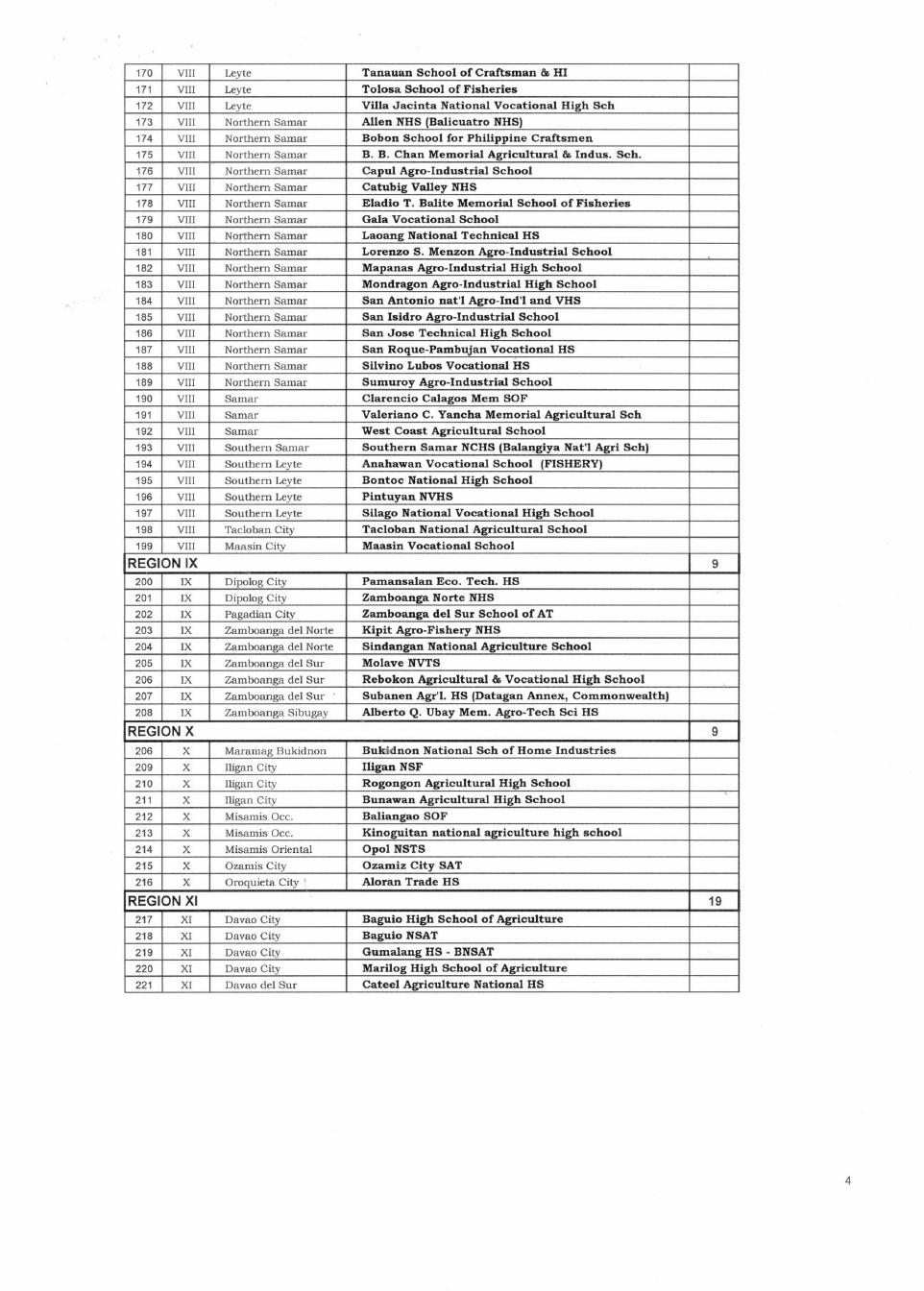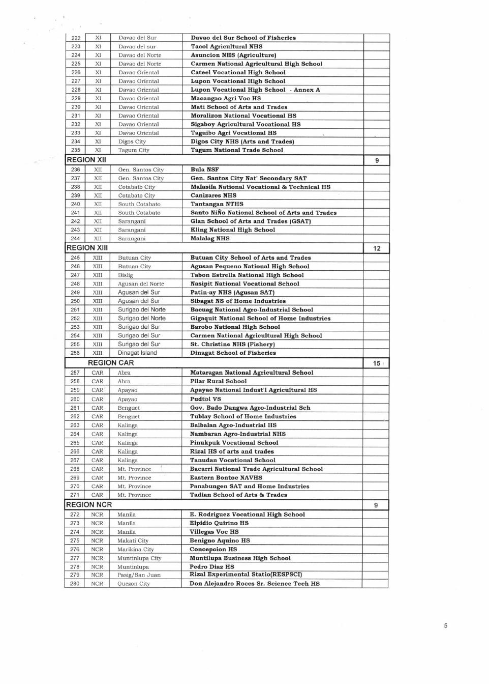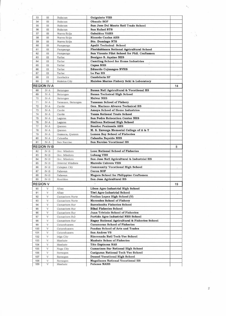 List of schools to implement the STVEP-CBC effective SY 2008-2009
