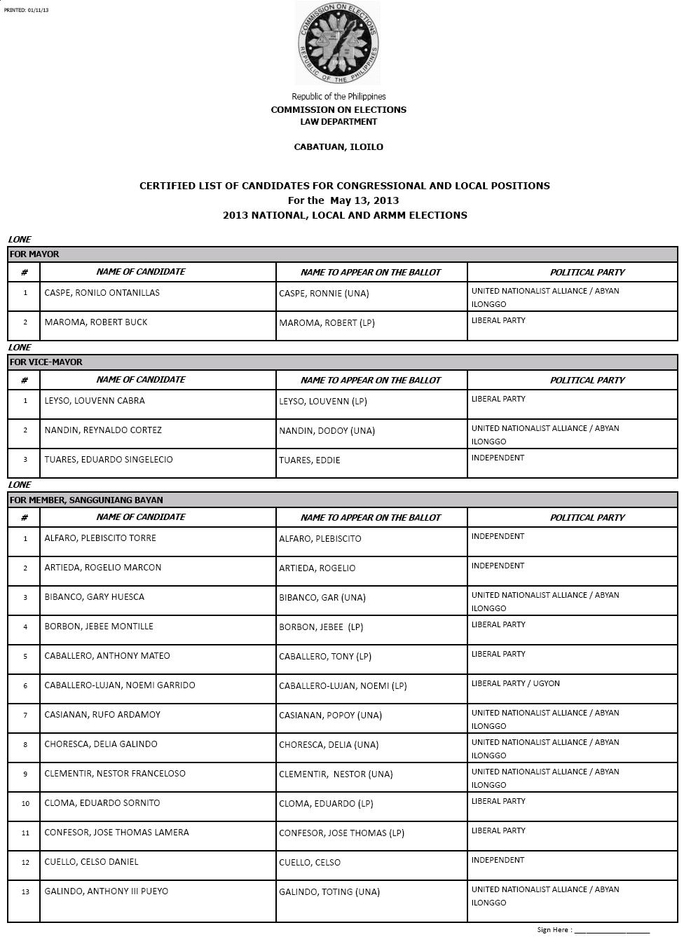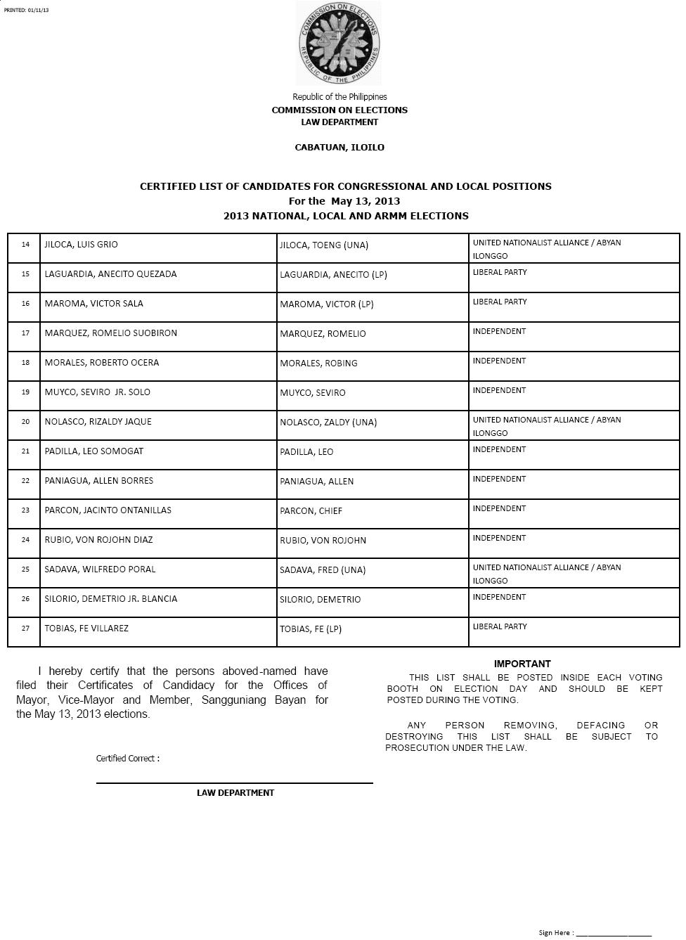CABATUAN - MAY 13, 2013 ELECTIONS