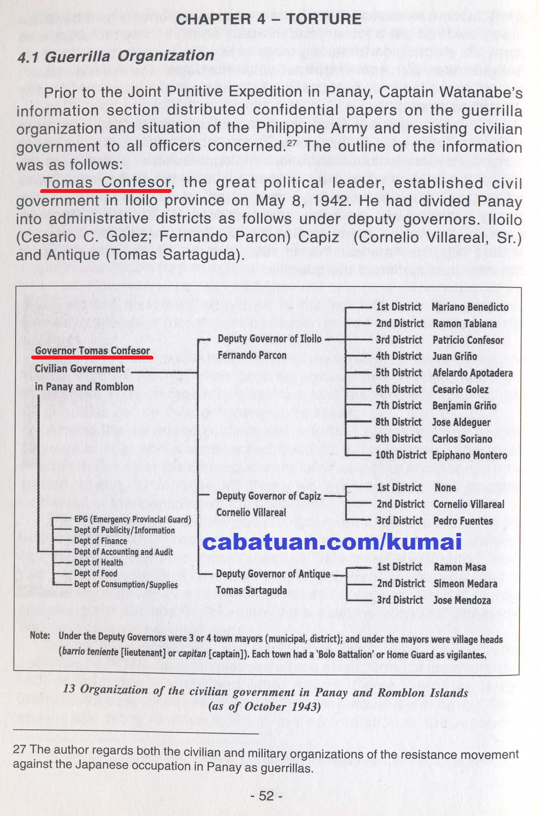 Tomas Confesor, the great political leader, established civil government in Iloilo province on May 8, 1942. He had divided Panay into administrative districts as follows under deputy governors. Iloilo (Cesario C. Golez, Fernando Parcon) Capiz (Cornelio Villareal Sr.) and Antique (Tomas Sartaguda).