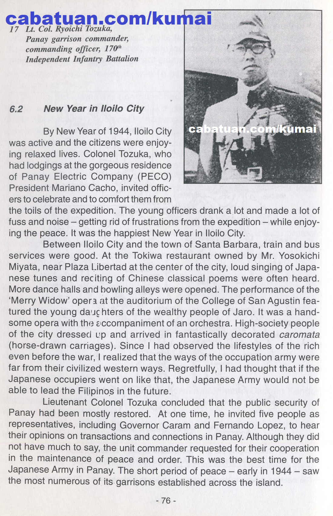 By New Year of 1944, Iloilo City was active and the citizens were enjoying relaxed lives. Colonel Tozuka, who had lodgings at the gorgeous residence of Panay Electric Company (PECO) President Mariano Cacho, invited officers to celebrate and to comfort them from the toils of the expedition. The young officers drank a lot and made a lot of fuss and noise getting rid of frustrations from the expedition while enjoying the peace. It was the happiest New Year in Iloilo City.