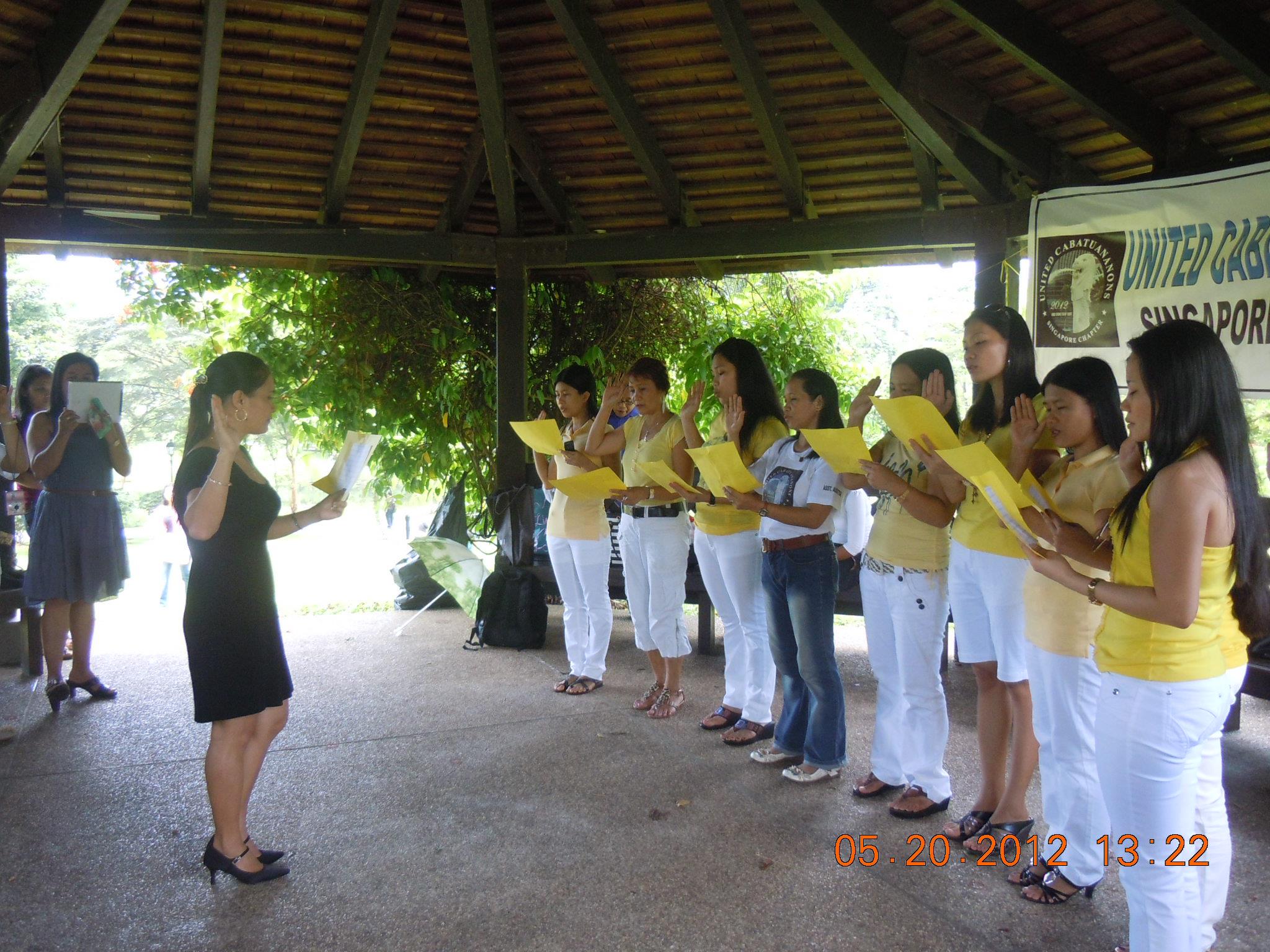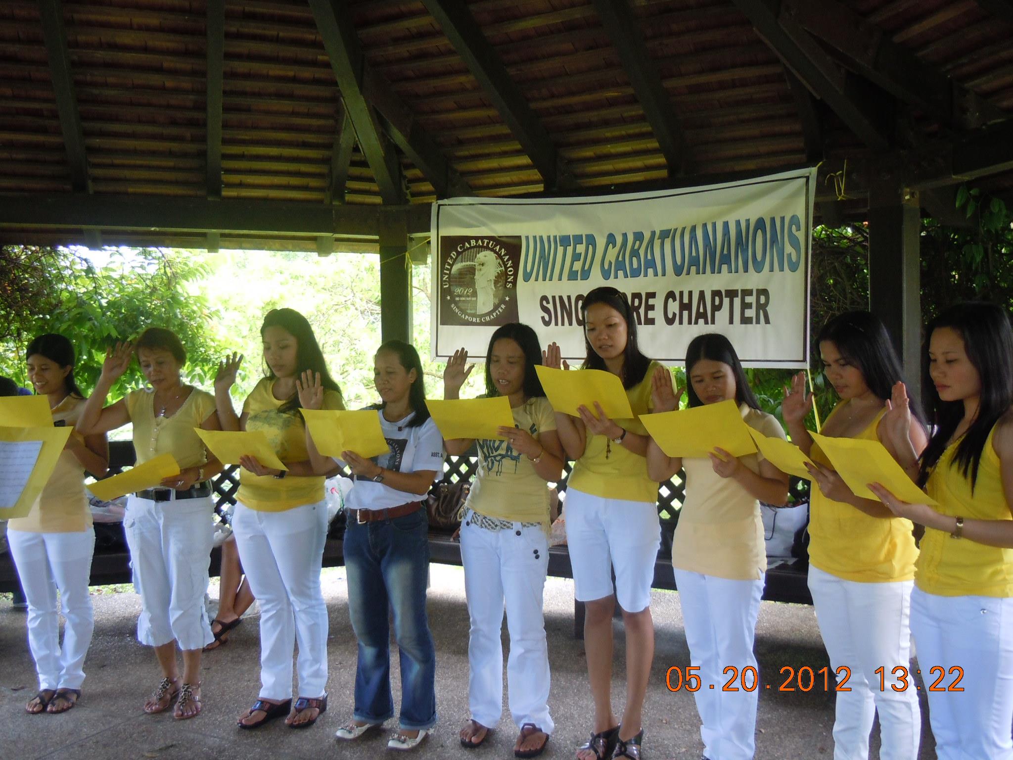 "Kami nga mga opisyales kang United Cabatuananons Singapore Chapter, naga sumpa, nga kutob kang amon masarangan, paga tinguhaan namon himuon ang mga bagay nga gina pa abot kanamon bilang opisyales kang diya nga katilingban; nga kami mangin ihimplo kang amon mga kasimanwa, kang pagsakdag kang pagkilalahanay kag pagtamdanay bilang isa ka Cabatuananon, giya sa Singapore kag sa bilog nga kalibutan." Taking their oaths were Ma. Daisy Caroline Jordan, Dhors Larios, Roselle Rute, Emelita Almaquer, Aprilmay Rute, Vevian Alinojan, Rafe Sapalaran, Meschel Misagal and Janice Morata. Lorenyl S. Vargas of Oton, Iloilo, swore them in, on behalf of Mrs. Ilma Ranada. UCab Singapore also celebrated the birthdays of Roselle Mercurio Rute and Roxan Marquez on Sunday, May 20, 2012, during the oath taking event. A first batch of officers took take their oath on April 29, 2012, due to differences in work schedules among the officers and members. They were Mae V. Figueroa, Minia Mallada, Nenen Moneva, Gemma-Ceballos Moneva, Ella Penit, Alice Pacheco Piz and Jonah Orbe. The United Cabatuananons - Singapore Chapter was created on May 5, 2011 as the official Cabatuan.com group in Singapore, with the objective of promoting and enhancing the communication, interaction and unity of Cabatuananons in that country and worldwide. Its core members are composed of Cabatuananons currently working or living in Singapore. The first acquaintance party was held on October 30, 2011 at Botanic Gardens, and the first Christmas Party was held on December 11, 2011, also at botanic Gardens. Its parent group, United Cabatuananons, was created on March 4, 2011. Infos and Photos by Ma. Daisy Caroline Jordan, Junalyn Morata Send this page to your facebook friends or groups. Click here ->