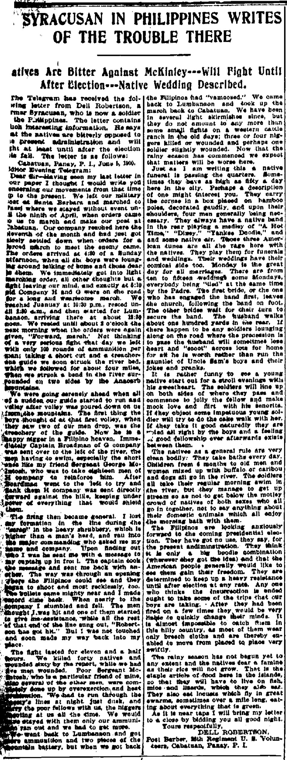 THE TELEGRAM HAS RECEIVED THE FOLLOWING LETTER FROM DELL ROBERTSON, A FORMER SYRACUSAN, WHO IS NOW A SOLDIER IN THE PHILIPPINES. THE LETTER CONTAINS MUCH INTERESTING INFORMATION. HE SAYS THAT THE NATIVES ARE BITTERLY OPPOSED TO THE PRESENT ADMINISTRATION AND WILL FIGHT AT LEAST UNTIL AFTER THE ELECTION IN FALL. THE LETTER IS AS FOLLOWS: